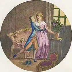 As the president of Société Patriotique et de Bienfaisance des Amies de la Vérité, d'Aelders's speeches on the social and living conditions of women were read and heard widely, garnering popular support from Parisian women.[8] As an eloquent speaker, she gained many listeners at society meetings as she spoke on politically charged topics like equal rights, better education and the right to divorce.[2] On 1 April 1792, accompanied by a group of women, d'Aelders addressed the Assembly. The group asked the assembly to admit women to civil and military roles, that the education of girls be based on the same principles as those of boys, that women could become adults at the age of 21, and that the law on divorce be promulgated. The response of the President of the Assembly was outright refusal. However, the Assembly did later take direct action as a result of Etta's proposals. On 20 September 1792, the first divorce decree was implemented. This decree granted divorce on a variety of grounds, including mutual consent, and marked an important step towards women's liberation.[2] The society survived until d'Aelders became a suspect of espionage in late 1792; the society then disappeared from the French public landscape.[12]