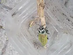 The body of E. giganteum is robust and elongated and the elytra have a wrinkled surface and a metallic green colour with reddish or purplish tinges. The pronotum has a dark spot on each side.[6][4] The larvae reach a length of about 12–15 centimetres (4.7–5.9 in).[6] The elytra of newly emerged adults have a coating of a yellowish, waxy powder. As the beetle ages this powder wear off.[4]