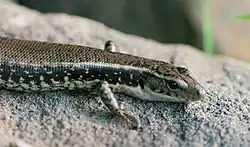 Eulamprus quoyii, more commonly known as the eastern water skink, eastern water-skink, or golden water skink, is a viviparous species of diurnal skink. Eulamprus quoyii belongs to the family Scincidae and is considered a common garden animal in Australia.[3] The skink is endemic to Australia and found only along the east coast of the country.[4] It makes its home in creekside habitats along the east coast of Australia and in urban garden areas with high amounts of moisture.[5] The species can be identified by the twin, long yellow stripes that run along its body from the top of the eye, as well as by several more specific character derived states.[6] The pale yellow dorsolateral stripes are most likely where its common name, the golden water skink, is derived. Like other ectotherms, the skink can often be seen basking in the sun on rocky outcroppings in order to regulate its body temperature.[7] Its diet mainly consists of both aquatic and terrestrial insects, tadpoles and small amounts of plant matter. The skink both hunts for food and scavenges when necessary and is considered an opportunistic feeder.[3] It is prey to larger lizards, snakes, cats and birds and so will often be seen moving quickly into hiding when other organisms are present.[3]
