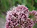 Eupatorium cannabinum is a perennial herb up to 1.75 metres (5.7 feet) tall forming extensive clumps, with the reddish stems covered in small hairs.[7] The leaves are opposite, deeply 3-lobed, occasionally 5-lobed, and have serrated margins.[3][7] It is dioecious, with racemes of mauve flower heads which are pollinated by insects from July to early September. The flowers are visited by many types of insects, and have a generalised pollination syndrome.[13] The flower heads are composed of dense clusters of 2–5 mm long florets of fluffy appearance, and can be pink or purple, or rarely whitish.[7] The fruit is an achene about 2 or 3 mm long, borne by a pappus with hairs 3 to 5 mm long, which is distributed by the wind. The plant over-winters as a hemicryptophyte.[12]