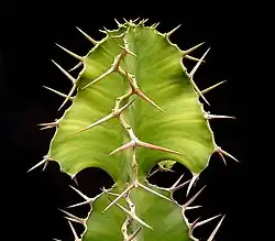 It is a perennial plant with a succulent quadrangular stem and double thorns on its edges. Bushy in shape, it reaches a size of 4.5 m in height, branched from the base, or occasionally a tree of up to 6 m, the branches are fleshy, erect and extended, the lowest are prostrate.[3]