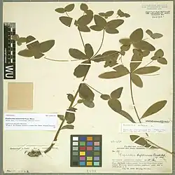 Euphorbia hylonoma is a species of flowering plant in the family Euphorbiaceae, native to China and the Far East of Russia (Primorsky krai). It grows on roadsides, valleys, mountain slopes, grasslands, steppes, scrub, sparse forests at elevations of 2,000–3,000 metres (6,600–9,800 ft).[1] This herbaceous plant is erect, reaching a height of 50–90 cm (20–35 in). It has thick roots measuring over 10 cm (3.9 in) in length and 3–5 mm (0.12–0.20 in) in diameter. The stem is branched at the top and has a thickness of 3–7 mm (0.12–0.28 in). The leaves are alternate, oblong to elliptic, with a size range of 4–10 cm (1.6–3.9 in) × 1–2 cm (0.39–0.79 in). The flowers are grouped in cyathia, with male flowers extending beyond the involucre and female flowers having pedicels. The capsule is globose and smooth, and the seeds are ovoid-globose, gray or light brown in color, and have a slightly striated surface. Flowering from April to June.[2]