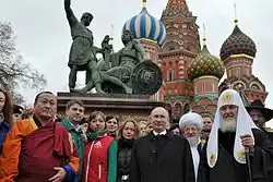 The Eurasia Movement is a National Bolshevik Russian political movement founded in 2001 by the writer Eduard Limonov and political philosopher Aleksandr Dugin.[35][36][37][38][39] The organization follows the neo-Eurasian ideology, which adopts an eclectic mixture of Russian patriotism, Orthodox faith, anti-modernism, and even some Bolshevik ideas. The organization opposes "American" values such as liberalism, capitalism, and modernism.[40]