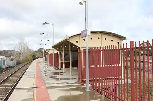 Euroa station was opened with the line, and the first permanent station building was erected in 1878. The platform was initially 300 feet (91 m) long, and was extended to 400 feet (120 m) in 1900. A second platform, 300-foot (91 m)-long, once existed at Euroa, against the goods shed wall. It was in use between 1880 and 1904, and permitted the crossing of two passenger trains. An iron footbridge linked the two platforms between 1900 and 1904.[2]