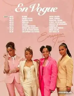 The European Tour was a concert and festival tour by American group En Vogue. Their first series of concerts on European soil since 2018, it began on June 18, 2025 in Antwerp, Belgium and concluded on July 6, 2025 in East Sussex, England. The tour marked the return of original member Maxine Jones,[1] who had rejoined the band in February 2025 after their NBA All-Star Game halftime show performance.[2]