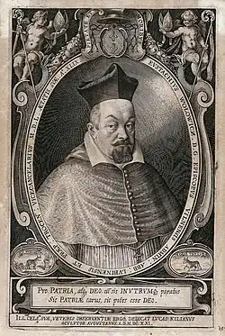 The bishop was also known for his taste in art.[57] In 1604, he commissioned an engraving of Pieta by Lucas Kilian.[58] Wołłowicz also commissioned four high quality portrait engravings by Kilian (in 1604, two in 1618, and in 1621). This is a stark departure from his predecessors who had only one often low-quality official portrait painting.[59] When his brothers funded the Benedictine Monastery in Tytuvėnai, Wołłowicz gifted it with a painting of the Mother of God for the main altar and co-sponsored its church bell.[60] Wołłowicz paid 50 złoty to a local unknown artist in Vilnius making the painting one of the oldest known surviving paintings produced in the city.[58][61] He also likely gifted doors of a church tabernacle by Matthias Wallbaum, goldsmith from Augsburg, to Vilnius Cathedral.[58] His largest commission was the Wołłowicz Chapel in Vilnius Cathedral. In 1612, he was allowed to construct the chapel.[16] It originally stood to the right of the main altar. However, the royal family was looking for a better place to house the relics of Saint Casimir. In 1624, Wołłowicz agreed to swap chapels with the royal family – his old chapel was demolished to make way for the Chapel of Saint Casimir while he remodeled the former royal chapel to the left of the entrance.[62] He was buried in the chapel and his epitaph survives to this day.[63] Wołłowicz also remodeled Verkiai Palace, summer residence of the bishops of Vilnius – he rebuilt the residence, established gardens with a drainage system that lifted water from the Neris River, and decorated the palace interior with 84 religious inscriptions.[64] The reconstruction was described in a Latin poem by Franciscus Sitański (Sitanius) published in 1626.[65]