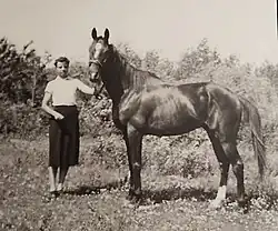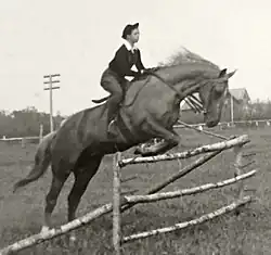 In 1943, Ring qualified out of twelve entries to compete in the Powder Puff Derby 6-horse field in Calgary.[40][41] The race was held at Victoria Park, Calgary, and was restricted to "lady riders" and "Thoroughbred and half-breds who have never raced on a major race course."[42] Some Star ridden by Mrs. A. Finch won the race by a length ahead of Little Barb with Mrs. Joan Hawes astride. Edna S. ridden by Mrs. C. Simpson was 3rd.[43] In September that same year, Ring attended the Edmonton Saddle Club's Gymkana, and placed in various horse races and jumping events.[44]