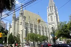 [1] Evangelical Lutheran Church of the Ascension (or more formally Accession Church) the first temple was built in 1895 and was founded on October 7, 1951. The building is situated in Novo Hamburgo with 476.48 meters square, built in neo-Gothic style; the architectural molds are from Cologne city in Germany. The vaults and arches of the temple are 14 meters high and the main tower is 58 meters. The tower houses two bells of steel brought from Germany in 1923. The windows on the altar in the center depict the rise of Jesus Christ.