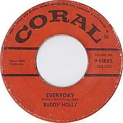 "Everyday" is a song written by Buddy Holly and Norman Petty, recorded by Buddy Holly and the Crickets on May 29, 1957, and released on September 20, 1957, as the B-side of "Peggy Sue". The A side "Peggy Sue" went to number three on the Billboard Hot 100 chart in 1957.[2] "Everyday" is ranked number 238 on Rolling Stone magazine's list of the "500 Greatest Songs of All Time".[3]