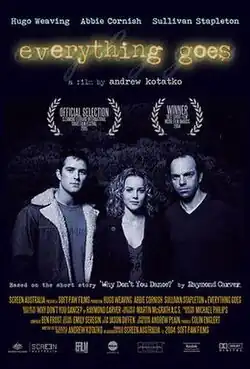Everything Goes (stylized as everything goes) is a 2004 short film directed by Andrew Kotatko. It is based on the 1978 short story "Why Don't You Dance?" from Raymond Carver's 1981 collection What We Talk About When We Talk About Love. The film stars Hugo Weaving, Abbie Cornish and Sullivan Stapleton. Everything Goes won the award for Best Short Film at the 2004 Inside Film Awards and was the only Australian film selected for the prestigious Clermont-Ferrand International Short Film Festival in 2005.