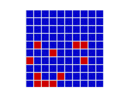 In a spatial evolutionary game contestants meet in contests at fixed grid positions and only interact with immediate neighbors. Shown here are the dynamics of a Hawk Dove contest, showing Hawk and Dove contestants as well as the changes of strategy taking place in the various cells