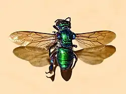 Exaerete smaragdina can reach a length of about 20 millimetres (0.79 in). Body color is metallic green. The metatibiae are three times longer than wide in both sexes. Like other "cuckoo bees", females lack a pollen-carrying apparatus.[2]