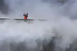 Along the publicly accessible bridge connecting Piers 15 and 17, artist Fujiko Nakaya created an installation called Fog Bridge #72494 that creates bursts of fog for six minutes every half-hour as the first in a series of large-scale temporary installations called Over the Water.[48] The Fog Bridge is 150 feet (46 m) long and makes use of 800 nozzles to create the fog, which Nakaya hopes will inspire visitors to pay attention to the nature of one of San Francisco’s best-known weather patterns. Although originally slated to be temporary, it is now on permanent display. A desalination system, located in Pier 17, conditions bay water for use in the artwork.[49][50]