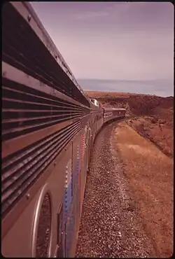 ![]() The Expo '74 rounds a curve near Wenatchee, Washington, on the ex-Great Northern route. Note the dome coach. | ||||||||||||||||||||||||||||||||||||||||||||||||||||||||||||||||||
