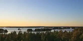 The park proper includes most of the fjärd of Färnebofjärden and the river's floodplain, as well as parts of the surrounding lowlands, for a total area of more than 10,100 ha (25,000 acres), of which 4,110 ha (10,200 acres) are water.[S 1] The only parts of the fjärd not included in the park are the peninsulas of Östa and Ista, since they are inhabited, but these are protected by nature reserves of 600 ha (1,500 acres)[10] and 770 ha (1,900 acres),[11] respectively. In addition, the park is bordered by several additional preserves: 920 ha (2,300 acres) at Hedesundafjärden, 950 ha (2,300 acres) at Jordbärsmuren-Ålbo, and 463 ha (1,140 acres) at Gysinge, for a combined area, with the park and peninsula reserves, of more than 3,000 ha (7,400 acres).