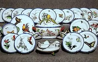 The service was then completed (teacups, coffee, etc.) and the manufacture left to the Creil and Montereau factory. Barluet, Lebeuf's successor, re-edited it in the early 1880s. In 1885, Eugène Rousseau sold his business to Ernest-Baptiste Leveillé, who continued to publish the service under his own brand. Many reissues or variants followed. Among them, that of the Manufacture Jules Vieillard in Bordeaux (late 19th century), that of the Crystal Stairs (early 20th century), or even of the faience of Gien The large birds still in reissue. It can also be noted that many pieces of this service are now preserved in various French national museums (Musée d'Orsay, Musée national Adrien Dubouché, etc.).[11]