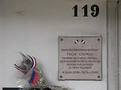 Cadras was executed by a German firing squad on 30 May 1942 at Fort Mont-Valérien, Paris, along with Arthur Dallidet, Louis Salomon and Jacques Decour. The executions were a reprisal for an attempted assassination in Le Havre on 23 May 1942.[10] Cadras was said to have been singing La Marseillaise when he was shot.[11] After the war Cadras was presented as a martyr by the Communist Party, an ideal of a young working-class militant. He was made a Chevalier of the Legion of Honor by a decree of 17 January 1961.[7] A school in Calais is named after him, and a street in Calais-Nord.[1]