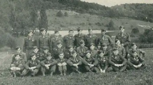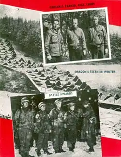 Of the Company men who had gone through the brutal 8-day battle of Kesternich, only eight men, 1st Sgt Rosenblatt, T-Sgt Horst, Sgts DiMarco, Clayton, Farnworth, and Pfcs Sharkey, Eikenberry, and Roberts, were able to go on. With a few Fox men who had not been through Kesternich, these eight men withdrew to Raeren Belgium, where S-Sgt Dallas E. Dimmer, the machine-gun section sergeant, received a Battlefield Commission.[22]