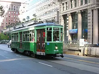 On September 1, 1995, the F line opened[6][7] with a parade of PCC cars, painted to represent some of the two dozen North American cities that this type of streetcar once served. Ridership exceeded expectations and the 8-Market trolleybus route that it had mostly replaced was completely discontinued on December 29, 1995.[4] At that point in history, this was a rare instance in which a streetcar replaced a bus line in operation, rather than the other way around. The need for extra cars resulted in the acquisition of ten Peter Witt-style cars then just being retired in the city of Milan, Italy. These cars were built in the 1920s to a design once common in North American cities, and their sister cars are still widely used on the Milan tramway network.