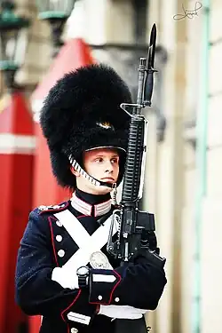 The Royal Guard (pictured) is required to be clean-shaven or bearded, depending on the style of facial hair that the monarch wears. Most operative personnel (except musicians and union representatives) are not allowed to wear beards (so as not to interfere with gas masks) unless the soldier obtains written permission to grow his beard from a flag officer; or the soldier already has a beard upon his enlistment and requests to continue growing it or maintain it at its exact length. However, during "out of area" operations (outside the North Atlantic area, like in Afghanistan) soldiers are permitted full beards.