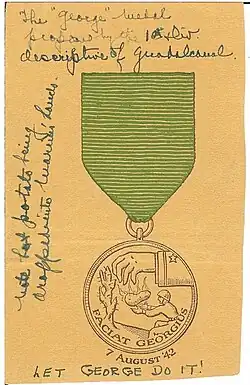 After the campaign, as the division was resting and refitting in Melbourne, Australia, Colonel (later Major General) Merrill B. Twining suggested that a commemorative medal be struck. He suggested that the ribbon be made of worn olive drab cotton twill fabric of the USMC M1941 utility uniform and bear the inscription “Let George Do It”—the division's informal motto from its training days, when its personnel seemed to draw more than their fair share of onerous assignments. The motto was translated into Latin by British coastwatcher Captain Martin Clemens, who was also awarded the medal. The artist was Captain (later Colonel) Donald L. Dickson, who drew the designs on captured Japanese postcards using a half dollar to draw the circles. The cost to receive a medal was one Australian pound. About 45 officers and senior enlisted men signed up to receive a medal.[2]