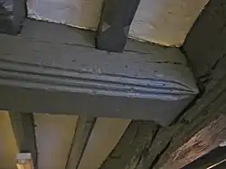 This is likely to be earlier 16th century in date.[5] It appears to have been a two storied, hall house, with cruck framing and stone walls. The evidence for the cruck roof is from a photography the Rev N W Watson,[6] and this roof may still be in place. Cyclopean doorways have been studied by Peter Smith,[7] who shows that they are distributed mainly in Denbighshire and Merionethshire. These massive arched stone door lintels were introduced at a time, probably around 1600, when stone walling was replacing timber framing and may encase an earlier timber structure. A much altered post and panel screens passage with three entrances,[8] now in the hall area of the main house, is likely to have been removed from the hall in the older house. This screens passage would have been associated with the finely moulded beams in the older house. These moulded beams can be compared with similar beams at Maesycastell in Caernarvonshire and Perthywig in Denbighshire which are illustrated by Smith[9]