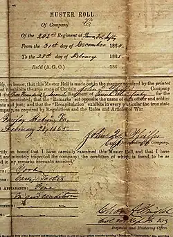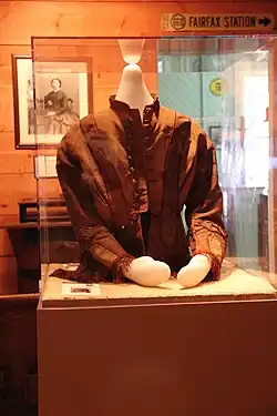 Among the Civil War artifacts are a muster list of the 202nd Pennsylvania Volunteer Infantry – a unit organized specifically to defend the railroads in northern Virginia[35] – and a guard duty report of the 15th Vermont Infantry Regiment. Modern vintage prints illustrate many of the major clashes, skirmishes, and raids at and around Fairfax Station, including John Mosby's March 1863 raid on Fairfax Courthouse and the march of a relief wagon train to Fairfax Station later that year. The commander of the wagon train, Richard N. Batchelder, then a lieutenant colonel, was awarded the Medal of Honor for his defense of the supply train against Mosby's Raiders.[36]