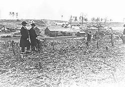 The agrarian quality of life around the station changed quickly as the station was converted to a communications post and field hospital. Federal forces used the station to evacuate wounded soldiers during the battles of Second Bull Run and Chantilly in 1862. An estimated 3,500 soldiers, perhaps hundreds more, made their way to the station where they were treated and returned to hospitals in Alexandria and Washington City. Clara Barton was among the civilian volunteers aiding the effort.[12] The depot was abandoned and destroyed on Sept. 2, 1862, as the fortunes of battle turned against Federal forces. Units returned by the end of the month and began rebuilding capacity but it would be years before another station building was constructed.[13]