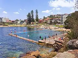 Fairlight Beach is located on the Manly Scenic Walkway[6] on Sydney Harbour, which can be followed for some kilometres (miles) to Spit Bridge. The beach experiences light harbour swells and southerly winds. Though swells up to 2 metres (6.6 ft) were recorded following Hurricane Larry, it is not a surfing beach, as the shore is rocky and the break unpredictable. The beach has sand largely made up of shell grit (largely missing from the beaches on either side), and a small tidal swimming pool.
