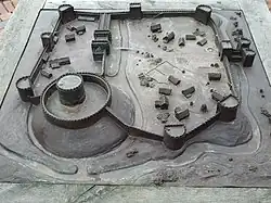 Model of how Bedford Castle may have looked. The River Great Ouse is on the left. The model predates archaeological excavations in 2007–8, which revealed the outlines of some of the main structures in the inner bailey (on the left here), including the great hall. The position of the main gate is unclear.
