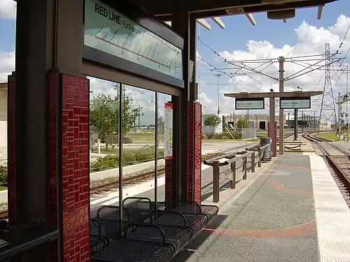 The single island platform, includes two shelters are located on the platform covering small seating areas, featuring custom made ceramic panels created by artist Jonathan Brown.[1] In having 1,437 spaces, this station is the only one along the Red Line with a designated parking facility operated by METRO (although others are located near private lots garages).[2] The trip to the Northline Transit Center/HCC station takes 52 minutes with trains operating a six-minute intervals during weekdays, at twelve-minute intervals during the evenings and weekend mornings/afternoons, and at twenty-minute intervals at night.[3]