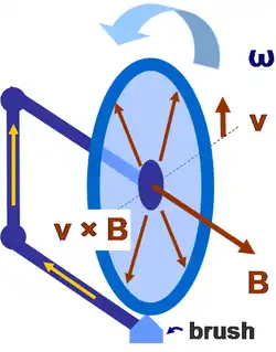 Careful thought showed that, if the magnetic field was assumed to rotate with the magnet and the magnet rotated with the disk, a current should still be produced, not by EMF in the disk (there is no relative motion between the disk and the magnet) but in the external circuit linking the brushes,[10] which is in fact in relative motion with respect to the rotating magnet. (The brushes are in the laboratory frame.)