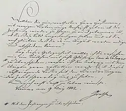 The red seal, which bore the family crest and which appeared on all products, was a sign of quality and authenticity. Each delivery was also accompanied by a signed document on which the directions for use were printed. According to the document, eau de Cologne was not exclusively intended for exterior use. It was described as good for dental hygiene, efficient against bad breath and a way of avoiding infectious diseases. In August 1785, a certain Mrs Duplessis from Nogent enquired whether eau de Cologne could in any way help her paralysed husband. In his response, Johann Maria Farina (III) suggested she dampen some pieces of cloth in the perfume before applying them to her husband's aching limbs and recommended she add 50 drops of eau de Cologne to his weekly drinking water. The letter ended as follows: “At least you run no risk of harming him in any way”.[9] However, the healing properties were removed from the instruction leaflet in 1811 and used only in advertisements. In 1803, the signature that had featured on the information leaflet was replaced by a stamp, which then made it possible to enclose a leaflet with each individual bottle.