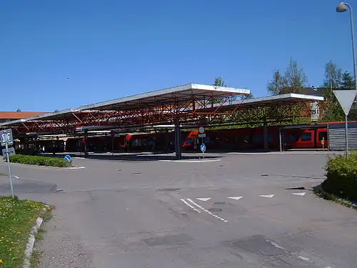 Farum station is the northern terminus of the Hareskov Line of Copenhagen's S-train network, a hybrid commuter rail and rapid transit system serving Greater Copenhagen. It is served regularly by trains on the B-line which have a journey time to central Copenhagen of around 30 minutes.[1] The station opened in 1906 with the opening of the Slangerup Line, and has been served by the S-train network since 1977.[2]