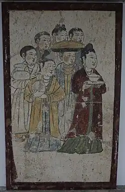 Tombs in haner families (i.e. Han Chinese of mixed origins or who have adopted some Khitan customs), for example the Zhang and Hann families, often depicts men dressed in Khitan clothing in corridors and antechambers while inner culture shows haner culture.[3] Some Han Chinese or Haner men adopted and mixed or combined Han clothing with Khitan clothing with Khitan boots and Han clothes or wearing Khitan clothes.[3]: 48, 52–53 [17] Han women on the other hand did not adopt Khitan dress and continued wearing Han dress.[3]: 48, 52–53 [17] For example, the tomb of Hann Shixun (a man from distinguished haner families) who died in the early 12th century during the late Liao dynasty depict Khitan-style clothing in the antechamber whereas women in Han Chinese-style clothing is seen in the painting found in the inner chamber.[3]: 44–45 Another example can be seen in a mural painting found in the tomb of Zhao Wenzao, where children and servants are depicted wearing Khitan hairstyles and Khitan-style clothing, while the woman who is standing behind the table is depicted in Han Chinese clothing.[3]: 46–47 During the Liao dynasty, Han Chinese women living in the Southern Division and Haner women were culture bearers, who generally preserved Han Chinese culture and continued to wear the Han Chinese clothing which was worn prior to the conquest.[3] In a tomb at Zhaitang, there are two female servants depicted standing by the doorway wearing Chinese clothing.[6]