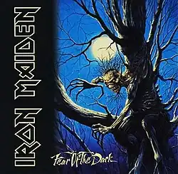 According to the band's biographer, Mick Wall, the Fear of the Dark album cover depicts their mascot, Eddie, "as some sort of Nosferatu tree figure leering at the moon".[7] It was the group's first not to be designed by artist Derek Riggs, whose contributions were rejected in favour of Melvyn Grant's.[7] According to Iron Maiden's manager, Rod Smallwood, the band began accepting contributions from other artists as "We wanted to upgrade Eddie for the 90s. We wanted to take him from the sort of comic-book horror creature and turn him into something a bit more straightforward so that he became even more threatening."[7] Following Fear of the Dark, Grant has produced several more covers for Iron Maiden, making him the band's second most-frequent artist after Riggs.