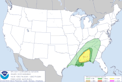 The warm side of the storm, in Alabama, had temperatures of nearly 70 °F (21 °C), an ingredient in forming powerful tornadoes.[56] On the morning of February 3, the Storm Prediction Center (SPC) issued a slight risk for tornadoes for portions of Mississippi and Alabama. The storm system spawned a supercell that produced three EF2 tornadoes in Western Alabama, the second of which struck areas near Sawyerville and caused significant high-end EF2 damage. One person was killed and eight others were injured, including three seriously. Two additional tornadoes, both rated EF0, impacted Elmore County as well, resulting in minimal damage.[57] The National Weather Service issued a particularly dangerous situation on the tornado warning for Sawyerville.[58] The tornado damaged 60 homes and destroyed 20 others.[59]
