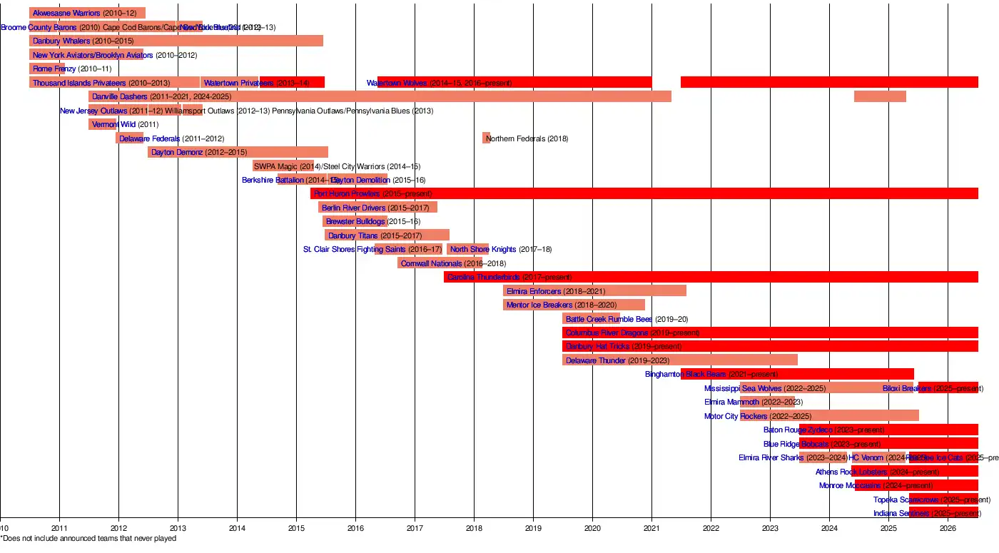 During the 2010–11 season, the Broome County Barons relocated to Cape Cod due to lack of fan support,[7][8] and Rome Frenzy suspended operations mid-season.[9]