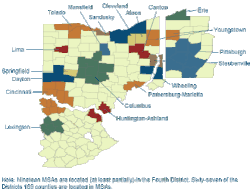 The Federal Reserve Bank of Cleveland is the Cleveland-based headquarters of the U.S. Federal Reserve System's Fourth District. The district is composed of Ohio, western Pennsylvania, eastern Kentucky, and the northern panhandle of West Virginia. It has branch offices in Cincinnati and Pittsburgh. The check processing center in Columbus, Ohio, was closed in 2005. Since August 21, 2024, Beth M. Hammack has been serving as the bank's chief executive officer and president.[1]