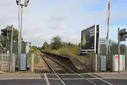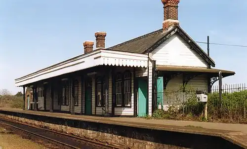 In 1971 the original signal box was closed and replaced by a prefab structure located by the level crossing gates. In 1976 the sidings at the station were removed, leaving just a single track and the unused platform.[7] The line was resignalled in 1999 and has since been controlled from Colchester Panel Signalling Box. It was decided to maintain the line as far as Felixstowe Beach to passenger standard in case a service to there is resumed in the future.[8] The station building was demolished by the Strategic Rail Authority in April 2004 but left the platform intact.[9] Suffolk County Council considered proposals to reopen the station in 2006.[10]