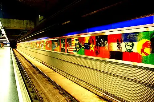 Feria de Madrid ([ˈfeɾja ðe maˈðɾið], "Madrid Fair"; previously "Campo de las Naciones")[1] is a station on Line 8 of the Madrid Metro. It is located in fare Zone A.[2] It gives service to IFEMA ("Fair Institution of Madrid"), an event center which holds, among other trade fairs, the Cibeles Madrid Fashion Week. It's also next to Parque Juan Carlos I, one of the most important parks in Madrid.