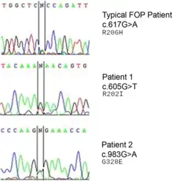 - ^ Petrie, KA; Lee, WH; Bullock, AN; Pointon, JJ; Smith, R; Russell, RG; Brown, MA; Wordsworth, BP; Triffitt, JT (2009). "Novel mutations in ACVR1 result in atypical features in two fibrodysplasia ossificans progressiva patients". PLOS ONE. 4 (3): e5005. Bibcode:2009PLoSO...4.5005P. doi:10.1371/journal.pone.0005005. PMC 2658887. PMID 19330033.