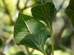 A medium to large sized, evergreen tree that can grow up-to 30m with a spreading canopy and many aerial roots. Its most distinguishing feature is its leaves, which have a unique pouch-like or cup-shaped base, ovate heart-shaped with 3 nerves. The leaves are thick, leathery, and glossy green, while velvety on both sides when young. The tree produces aerial roots that grow into robust structures, similar to the banyan tree Ficus benghalensis.[2]