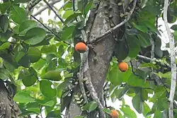 Ficus punctata of the Mulberry Family (Moraceae) is a lesser-known climbing liana or groundcover reported from Myanmar, the Andaman-Nicobar Archipelago, Thailand, Indochina, Malaysia, and Indonesia with remarkable ornamental value.[1] It is a handsome woody liana with spectacular white spotted orange or red fruits.[2] This taxon occurs in disturbed forests and rarely along the edges of the evergreen forests. This species has remarkable ornamental value and can be introduced in gardens. This Ficus can be identified in the field by its climbing habit, presence of milky latex, rhomboidal obovate coriaceious leaves, and beautiful spotted crimson-orange fruits. Its symbiotic partner is the fig wasp Wiebesia contubernalis, which pollinates it.