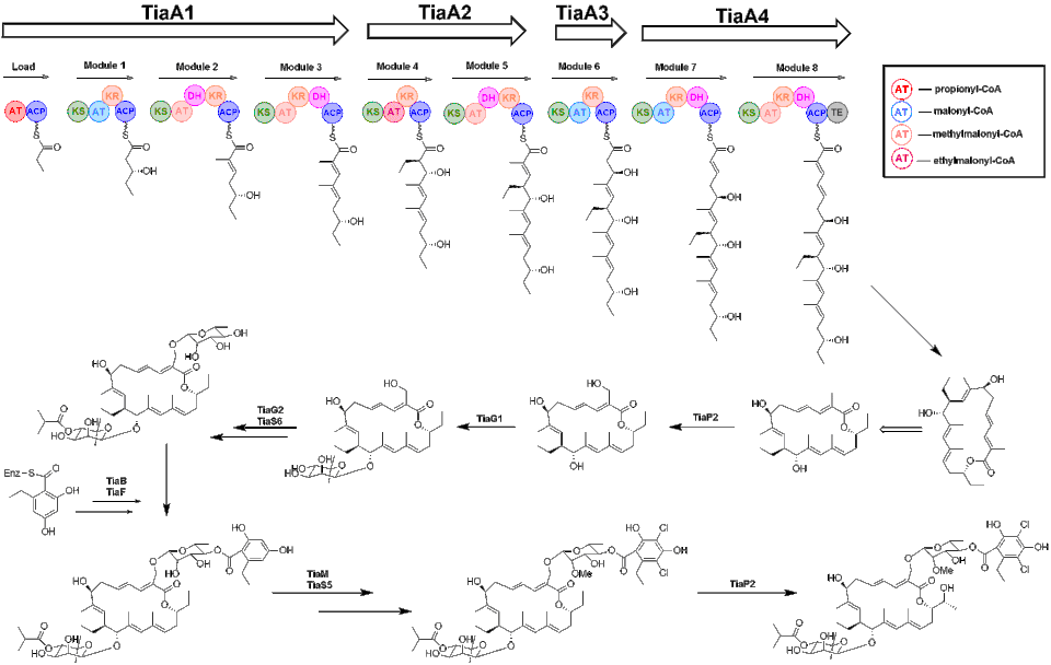 The biosynthetic pathway of fidaxomicin, also known as tiacumicin B, was first proposed in 2011 by Zhang et al. based on the identification of and sequence analysis of the tiacumicin B tia-gene cluster. The biosynthesis begins with the formation of the core aglycone, tiacumicinone, done by a type I polyketide synthase (PKS) coded for by the tiaA1-tiaA4 genes. The PKS is composed of a loading domain and eight elongating domains. Tiacumicinone formation starts when the loading acyltransferase domain loads propionyl-CoA onto the loading acyl carrier protein (ACP) domain. The following eight modules extend and tailor the polyketide using malonyl-CoA, methylmalonyl-CoA, and ethylmalonyl-CoA. The final thioesterase domain hydrolyzes the polyketide to form the 18-membered tiacumicinone aglycone.[10] Modification to the aglycone begins with oxidation at the C(20) position by TiaP2, a cytochrome P450. This is followed by attachment of ᴅ-noviose at the OH-C(11) position by the glycotransferase TiaG1. Next, the glycotransferase TiaG2 binds ᴅ-rhamnose at the OH-C(20) position followed by the attachment of an isobutyric ester at the OH-C(4’’) position of the noviose. TiaB, which codes for another type I PKS, forms an homoorsellinic acid moiety from propionyl-CoA and three malonyl-CoA elongating units that is coupled to rhamnose at the OH-C(4’) position by the TiaF, a ketoacyl ACP synthase. This is followed by chlorination of the aryl moiety by the halogenase TiaM and methylation of the OH-C(2’) position of rhamnose by the methyltransferase TiaS5. Lastly, there is another oxidation by the cytochrome P450 TiaP1 that oxidizes at the C(18) position of the aglycone to give tiacumicin B.[11]
