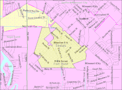 "2010 CENSUS - CENSUS BLOCK MAP: Fifth Street CDP, TX" (PDF). U.S. Census Bureau. Retrieved September 28, 2020. - Compare this with FBISD school boundary maps and with extraterritorial jurisdiction maps. - ^ a b "Fort Bend County Cities & ETJs" (PDF). Fort Bend County. Retrieved March 10, 2024. - Compare with the CDP map.