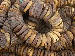 Another manner of preparation was to take figs that had already been dried and to open them up and put one on top of the other, producing cakes known as keziah (קציעה).[20] Straw was often spread on top of them to help in their preservation.[21] These, unlike the regular fig cake, did not last long and usually became worm-infested after a short time.[22] They were made into round or square cakes.[22]