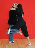 Abrazo abierto | Open embrace | Tango nuevo, salon | In open embrace, there can be as much space as desired between the partners, but there should always be complete contact along the embracing arms to give optimum communication. Argentine tango dancers do not hold their upper bodies arched away from each other; each partner is over their own axis. Whether open or closed, a tango embrace is not rigid, but relaxed, like a hug. | ![]() | |