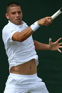 In February 2010, he took part in Challenger tournament GEMAX Open in Belgrade, defeating Somdev Devvarman in the first round but losing to Alex Bogdanovic.[13] Krajinović played the qualifications for the BNP Paribas Open. He defeated former French Open champion Gastón Gaudio in three sets in the first round, but then lost to Tim Smyczek in the second.[14] During the tournament, Krajinović practiced along with world No. 1 player Roger Federer.[15] Upon losing to Harel Levy in the second round of Challenger in Sunrise qualifying, he was awarded with a wild card for Sony Ericsson Open main draw,[16] where he lost to former world No. 4 player James Blake in three sets in the first round.[17] Krajinović then earned a wild card for 2010 Barcelona Open Banco Sabadell,[18] where he lost to Juan Ignacio Chela in the first round.[19] Receiving a wild card for 2010 Serbia Open, Krajinović collected his first ATP World Tour victory over Evgeny Donskoy. He then defeated Horacio Zeballos in the second round and won the first set against the first seed and world No. 2 Novak Djokovic in the quarterfinals when Djokovic retired.[20] Krajinović lost to the third seed and eventual tournament winner Sam Querrey in the semifinals. He then joined Viktor Troicki and Nenad Zimonjić in the team of Serbia at the World Team Cup in Düsseldorf, Germany.[21] Krajinović also made the second Challenger final of his career in Košice, Slovakia.