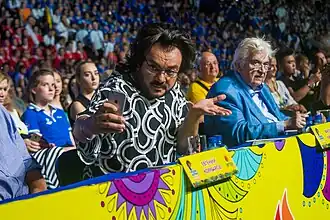 Starting in the 2000s, Kirkorov became increasingly involved in music production, managing and mentoring several Russian artists he personally discovered.[25] He co-wrote the Belarusian entry at the Eurovision Song Contest 2007, "Work Your Magic" for Dmitry Koldun, wrote the 2008 Ukrainian entry "Shady Lady", performed by Ani Lorak, and also co-composed Moldova's Eurovision entry for the 2021 contest, "Sugar", which was performed by Natalia Gordienko. He was also a judge in the second season of Music Idol in Bulgaria. Kirkorov makes a cameo in Verka Serduchka's video "Do Re Mi".